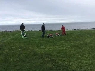 Klargjøre fyrets tårnfot for ny utstilling av de fyrstasjonene som en ser fra Alnes.